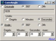 - Programme exécutable : ConvAngle.exe v1.0 - Copyright ©2003 Christophe GOI - Convertisseur de durées : degrès,minutes... en décimale et réciproquement.
